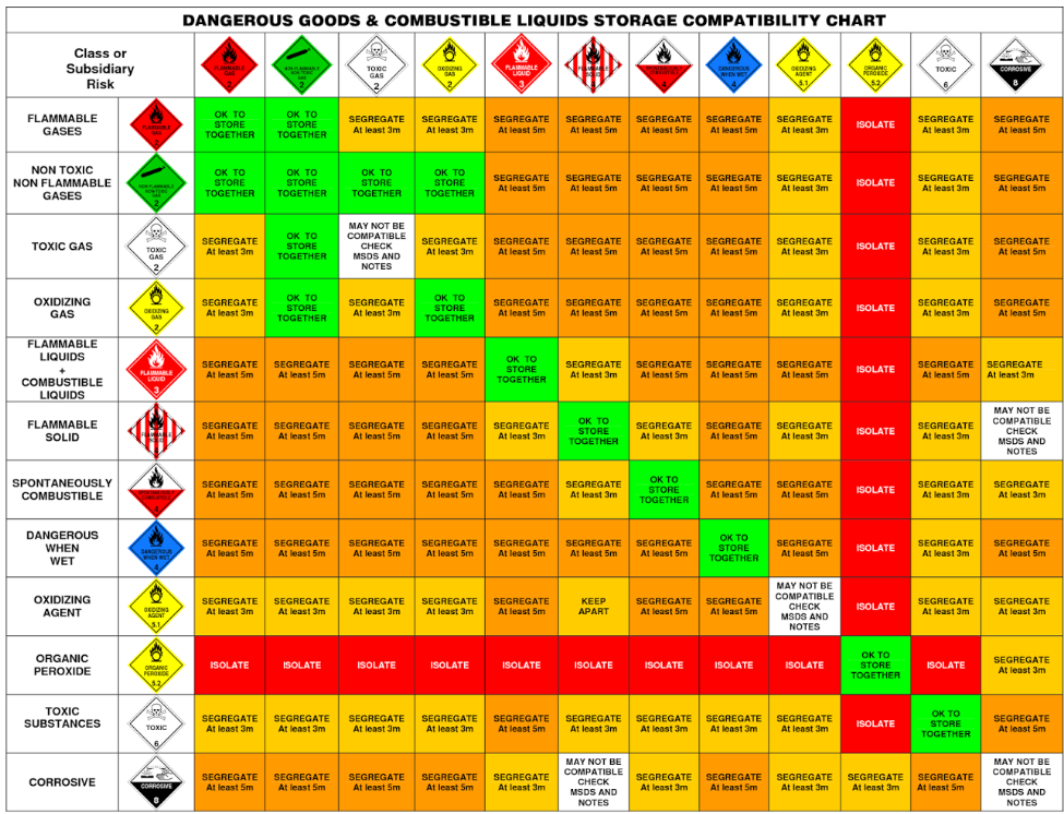 เมื่อสารเคมีถูกส่งมาถึงพื้นที่ ก็ต้องจัดเก็บให้ได้มาตรฐาน แยกจัดเก็บให้ถูกต้อง เพื่อป้องกันเหตุรั่วไหลหรือไฟไหม้จากการจัดเก็บไม่ถูกต้อง เช่น ถังก๊าซต้องมีโซ่คล้อง, ของเหลวต้องมีขอบเขื่อนกักเก็บการรั่วไหลที่เพียงพอ, สารไวไฟต้องติดตั้งอุปกรณ์ไฟฟ้าแบบกันระเบิด เป็นต้น
